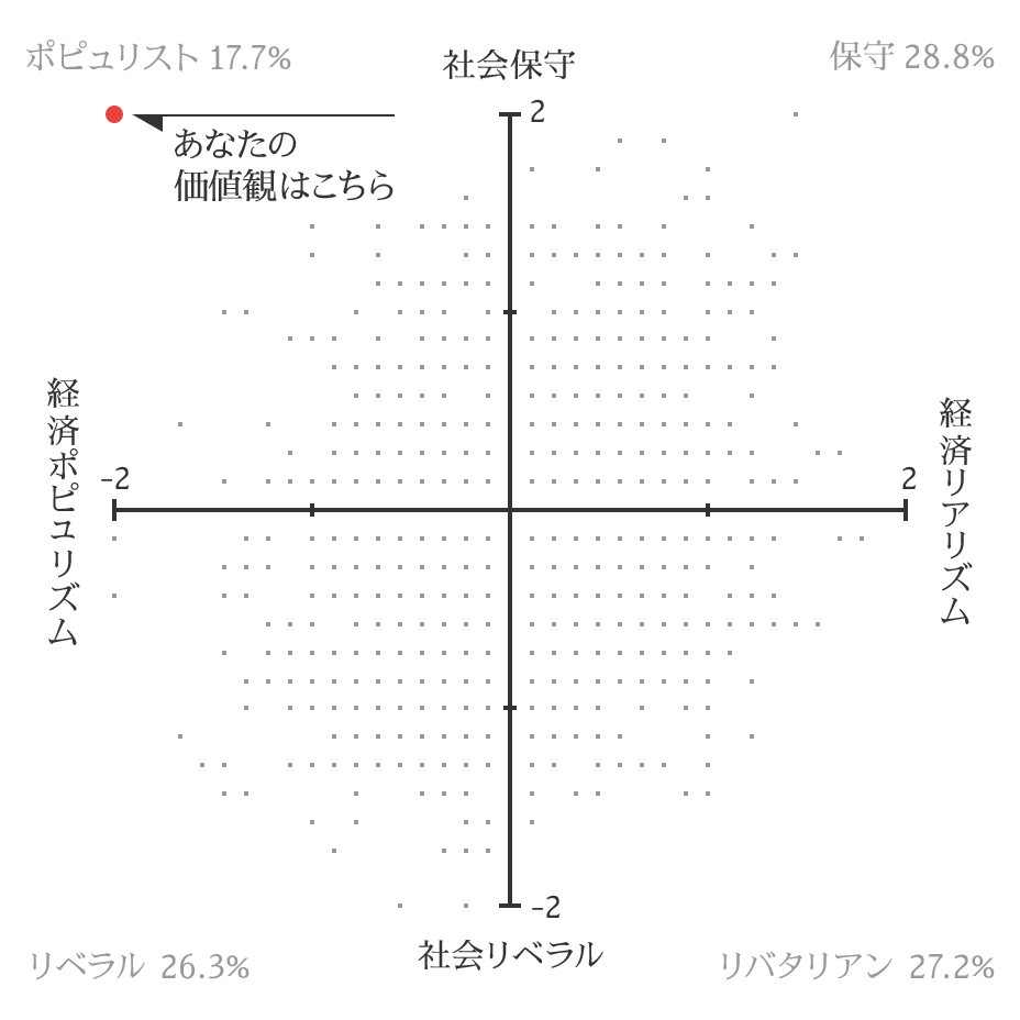 あなたはポピュリストです。この象限に当てはまる人は、従来からある社会秩序を維持することを望み、伝統的な文化や価値を守るための国家の役割に期待するとともに、経済においても国家主導の産業政策や再分配を望む傾向にあります。社会と経済の両面において、政府に大きな役割を期待することで、国家としての一体性や秩序を保ちながら不平等を減らすことを望む勢力であると自らを定義していますが、成長への関心は二次的です。
