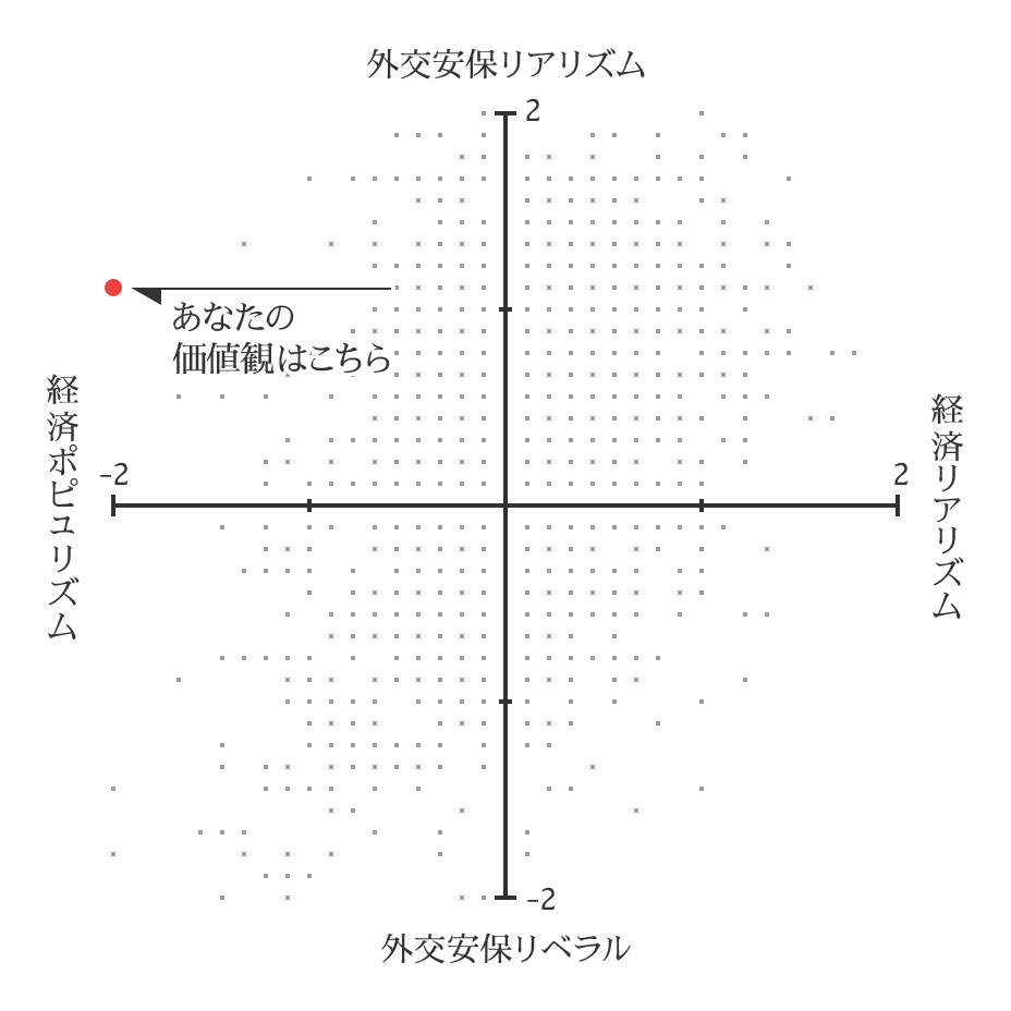 上記の保守、ポピュリスト、リベラル、リバタリアンの四分類に加えて、二番目の散布図ではあなたの外交安全保障の分野に関する価値観と、経済政策に関する価値観のポジションを示しています。外交安保リアリズムとは、憲法改正や日米同盟強化、自衛隊の役割拡大などに賛同する立場であり、現実主義に基づいて一定の軍備を必要とする考え方です。外交安保リベラルとは、憲法改正や日米同盟強化に反対し、自衛隊の役割の拡大にもくみしない立場で、限定された軍備を望む考え方です。