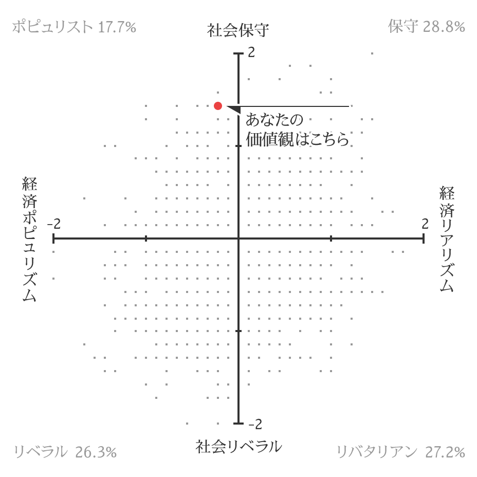 あなたはポピュリストです。この象限に当てはまる人は、従来からある社会秩序を維持することを望み、伝統的な文化や価値を守るための国家の役割に期待するとともに、経済においても国家主導の産業政策や再分配を望む傾向にあります。社会と経済の両面において、政府に大きな役割を期待することで、国家としての一体性や秩序を保ちながら不平等を減らすことを望む勢力であると自らを定義していますが、成長への関心は二次的です。