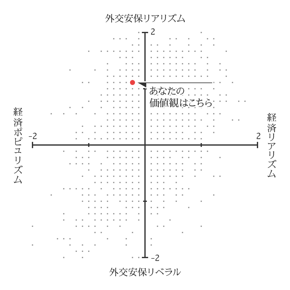 上記の保守、ポピュリスト、リベラル、リバタリアンの四分類に加えて、二番目の散布図ではあなたの外交安全保障の分野に関する価値観と、経済政策に関する価値観のポジションを示しています。外交安保リアリズムとは、憲法改正や日米同盟強化、自衛隊の役割拡大などに賛同する立場であり、現実主義に基づいて一定の軍備を必要とする考え方です。外交安保リベラルとは、憲法改正や日米同盟強化に反対し、自衛隊の役割の拡大にもくみしない立場で、限定された軍備を望む考え方です。
