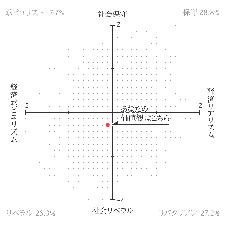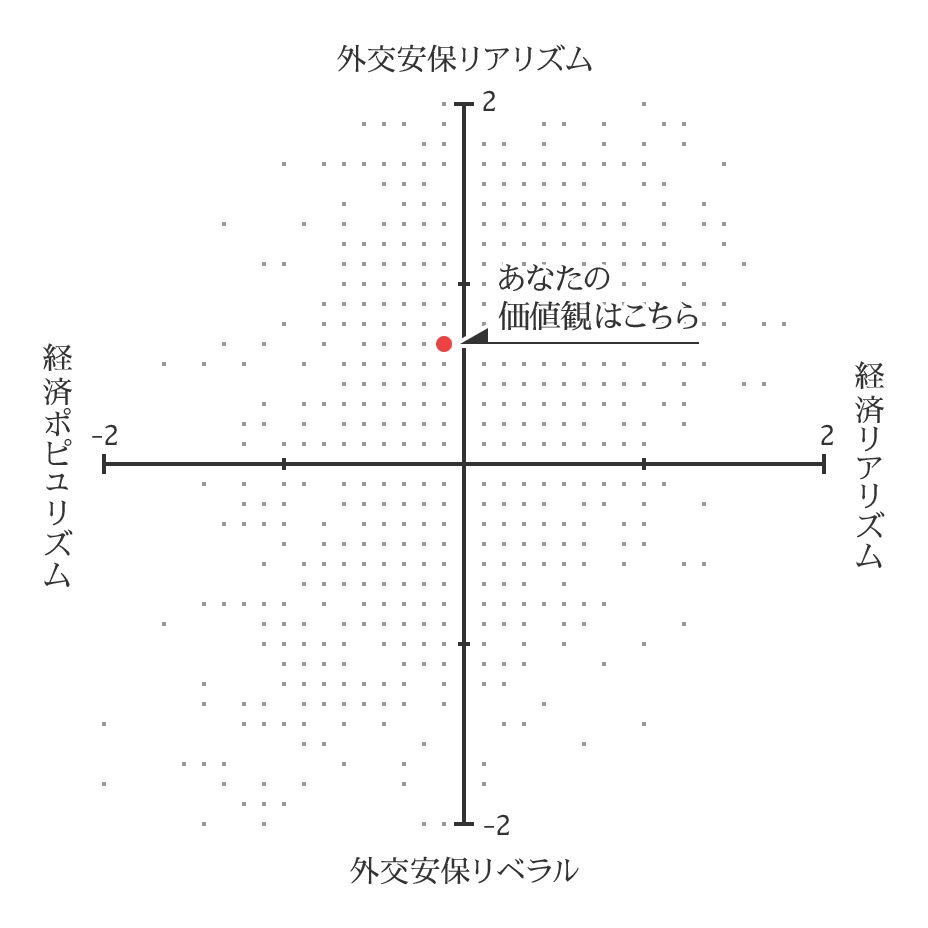 上記の保守、ポピュリスト、リベラル、リバタリアンの四分類に加えて、二番目の散布図ではあなたの外交安全保障の分野に関する価値観と、経済政策に関する価値観のポジションを示しています。外交安保リアリズムとは、憲法改正や日米同盟強化、自衛隊の役割拡大などに賛同する立場であり、現実主義に基づいて一定の軍備を必要とする考え方です。外交安保リベラルとは、憲法改正や日米同盟強化に反対し、自衛隊の役割の拡大にもくみしない立場で、限定された軍備を望む考え方です。