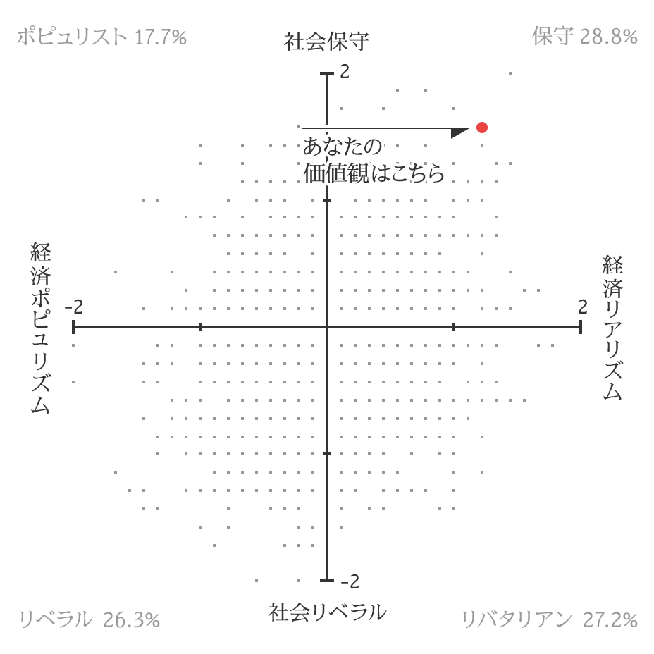 あなたは保守です。この象限に当てはまる人は、従来からある社会秩序を維持することを望み、伝統的な文化や価値を守るために国家の役割を期待する傾向にあります。他方、経済分野における政府の役割や民間企業への介入についてはより懐疑的です。民間主導の経済成長を重視し、税制も成長に資するものを支持します。