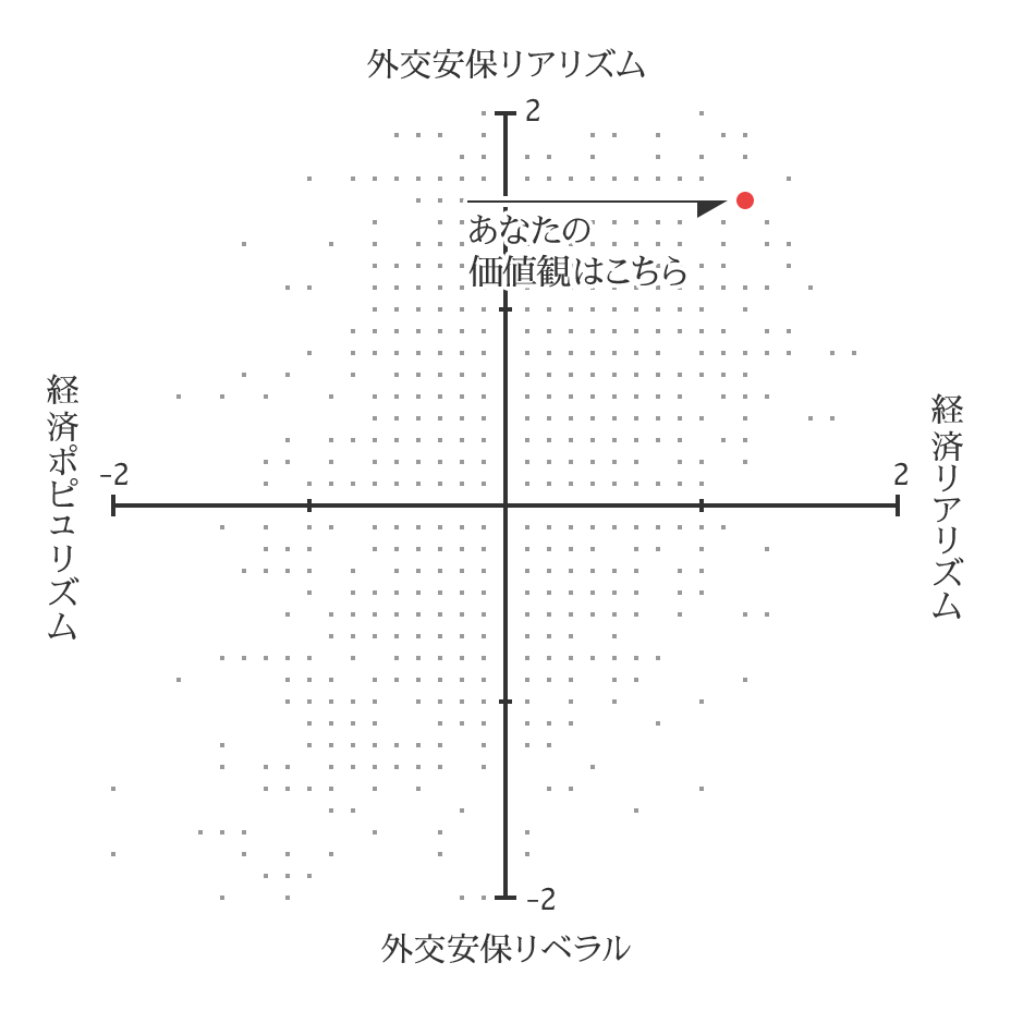 上記の保守、ポピュリスト、リベラル、リバタリアンの四分類に加えて、二番目の散布図ではあなたの外交安全保障の分野に関する価値観と、経済政策に関する価値観のポジションを示しています。外交安保リアリズムとは、憲法改正や日米同盟強化、自衛隊の役割拡大などに賛同する立場であり、現実主義に基づいて一定の軍備を必要とする考え方です。外交安保リベラルとは、憲法改正や日米同盟強化に反対し、自衛隊の役割の拡大にもくみしない立場で、限定された軍備を望む考え方です。
