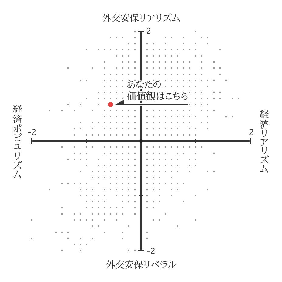 上記の保守、ポピュリスト、リベラル、リバタリアンの四分類に加えて、二番目の散布図ではあなたの外交安全保障の分野に関する価値観と、経済政策に関する価値観のポジションを示しています。外交安保リアリズムとは、憲法改正や日米同盟強化、自衛隊の役割拡大などに賛同する立場であり、現実主義に基づいて一定の軍備を必要とする考え方です。外交安保リベラルとは、憲法改正や日米同盟強化に反対し、自衛隊の役割の拡大にもくみしない立場で、限定された軍備を望む考え方です。