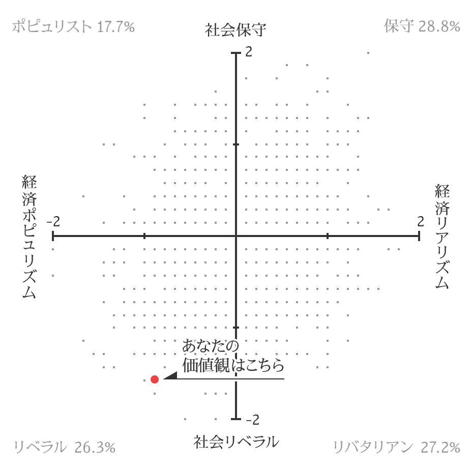 あなたはリベラルです。この象限に当てはまる人は、ライフスタイルに関する個人の選択の自由を尊重し、多様性と少数者の権利を信じています。社会正義のための国家による介入には肯定的で、格差是正や少数者の権利保護のために積極的な国家の役割を期待します。成長への関心は二次的で、資本主義の行き過ぎを是正する最適な政治経済体制を望む傾向にあります。自由を信じている一方で、社会的な価値観は収斂すべきだとみなす傾向にあります。