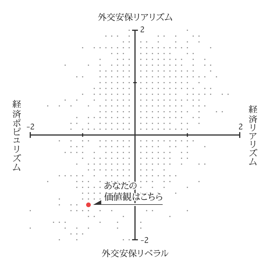 上記の保守、ポピュリスト、リベラル、リバタリアンの四分類に加えて、二番目の散布図ではあなたの外交安全保障の分野に関する価値観と、経済政策に関する価値観のポジションを示しています。外交安保リアリズムとは、憲法改正や日米同盟強化、自衛隊の役割拡大などに賛同する立場であり、現実主義に基づいて一定の軍備を必要とする考え方です。外交安保リベラルとは、憲法改正や日米同盟強化に反対し、自衛隊の役割の拡大にもくみしない立場で、限定された軍備を望む考え方です。