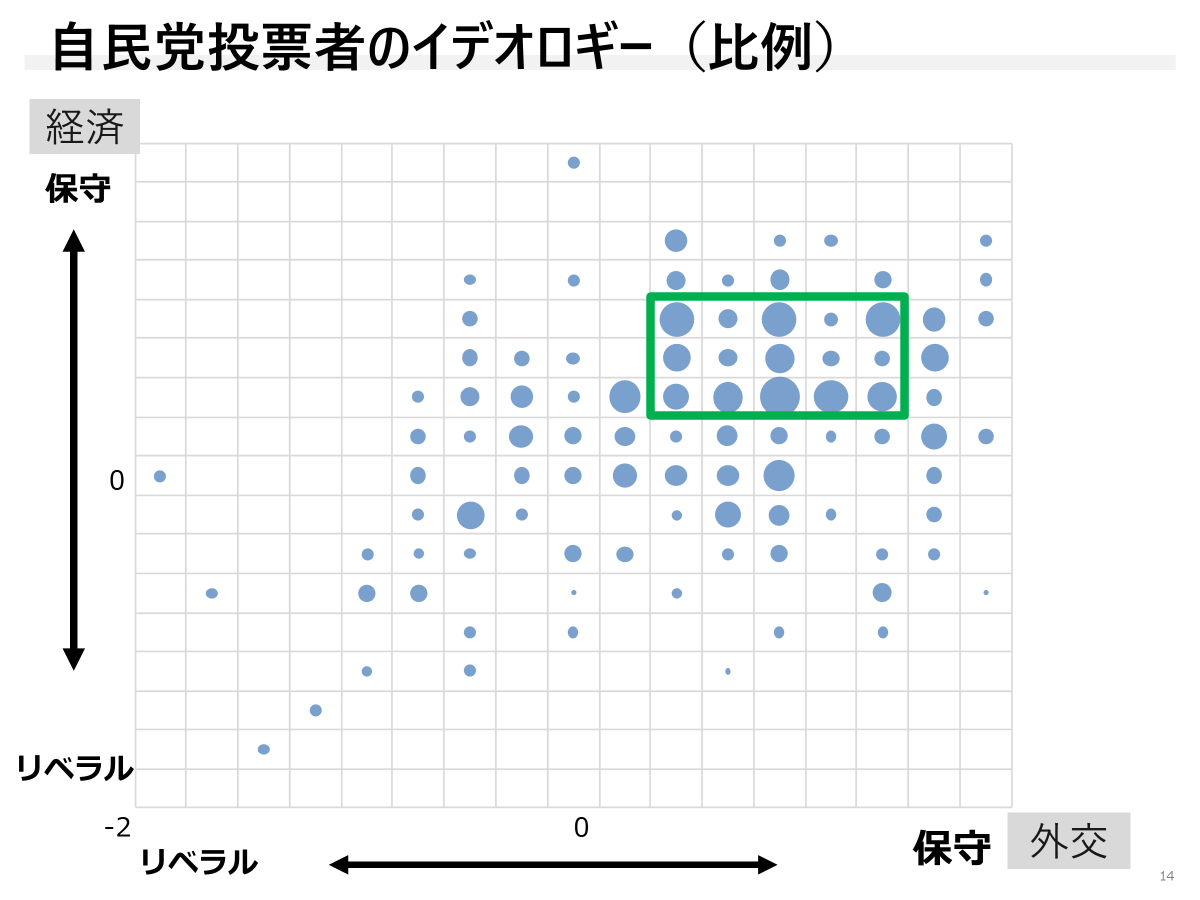 昨年の衆院選、今年の参院選で社会保守・安保保守の票が自民党から流出していますが、自民党に残った人々も保守なので、重要な価値観の差は変革期待です。